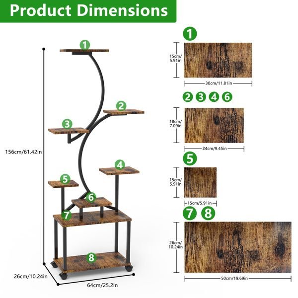 This 61.42in indoor plant shelf features 8 tiers for at least 8 pot plants and 1 hook on the top tier for hanging potted plant. Unique S-shaped design makes it an artistic addition and a stylish display shelf for decorative items. Also provide adjustable full spectrum grow lights with 10 brightness levels, 3 light modes and 3 timer settings, catering to the varying light needs of plants at different stages and enhancing their growth. Stable and sturdy. Easy to install with detailed user manual and clear labels on the tools and boards.