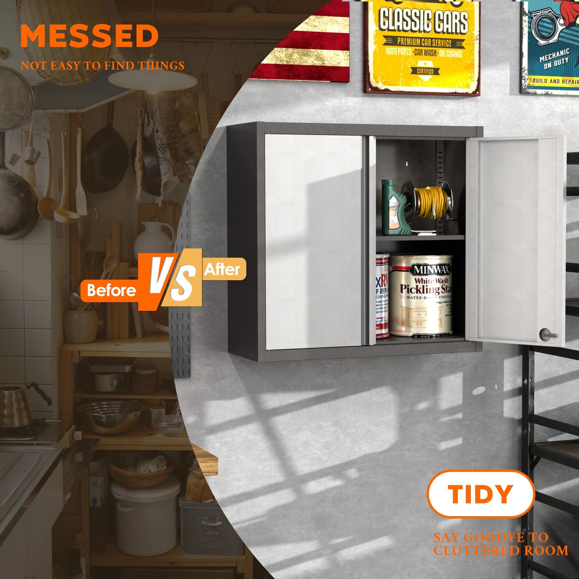 • ✔Versatile cabinet: This wall cabinet can utilize the spare wall space in the Garage Workshop, kitchen and corridor to build a convenient and neat living environment.The door can hide personal belongings, keeps away from dust and splashes, and always place them in a neat and orderly manner.