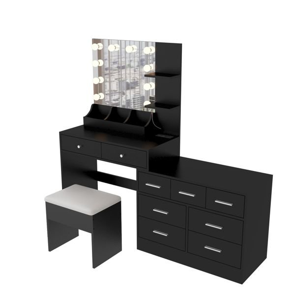 1. 2-in-1 Vanity and Dresser Combo: This multi-functional vanity combines the best of a makeup station and dresser, providing 3 storage compartments on tabletop, 9 drawers, 3 tabletop shelves, and 2 staggered tabletops to keep all your makeup, skincare, and accessories neatly organized and easily accessible.