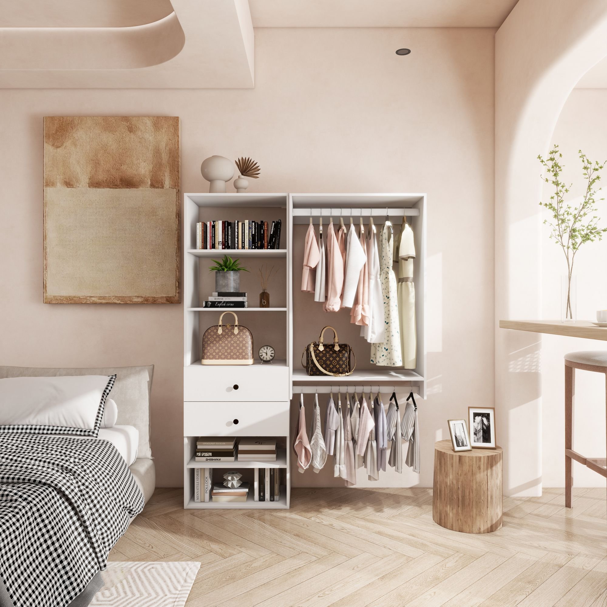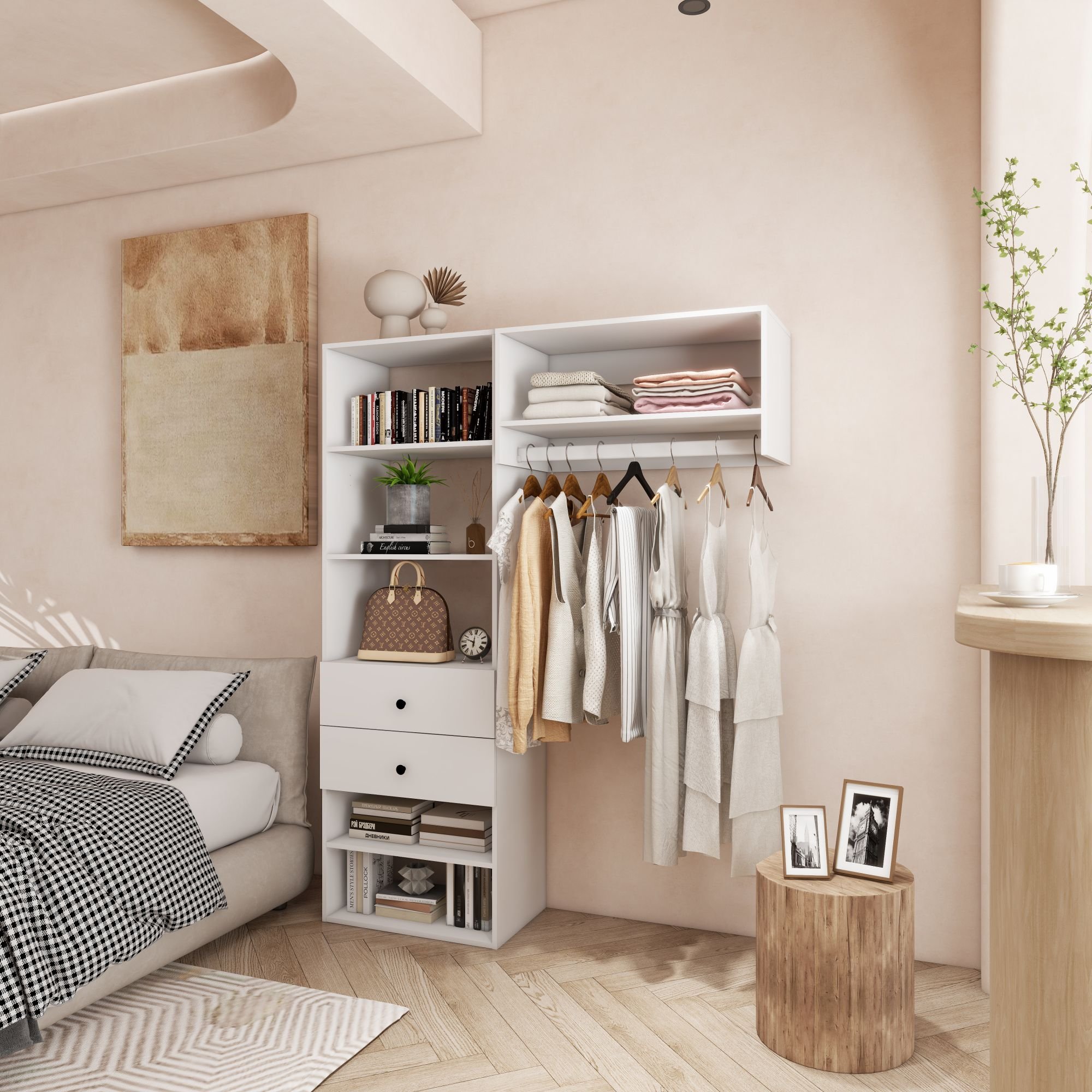 Livelylodge Modular Closet Organizer System: Modern White Open Wardrobe Closet for Bedroom Walk In Closet with 2 Drawers & 6 Shelves & 1 Hanging Rods