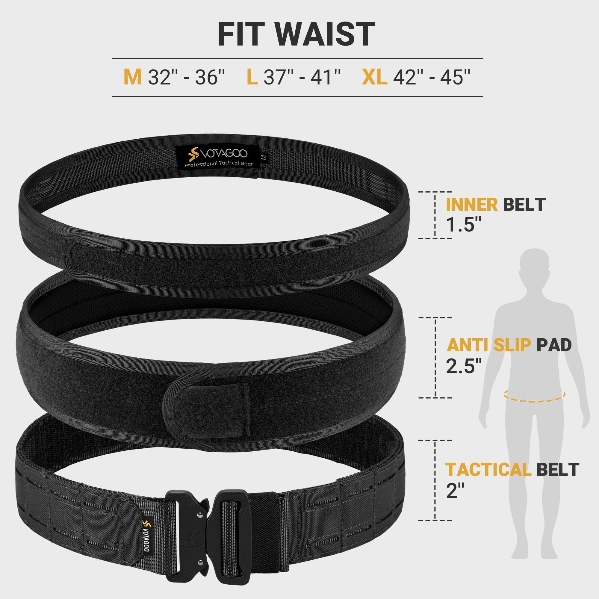 [Buy One Get Three]Battle belt 2'' inner belt built by 2-ply nylon webbing, with Laser-cut MOLLE system for attaching tactical gears; Inner loop belt fits in the vast majority of military/civilian style pant belt hooks; Anti-slip loop belt helps the belt stay in place during rigorous use.[Adjustable & Size]Tactical belt outer webbing belt is easy to adjustable length to fit your need , to fit 32"-45" waist size. Shooting belt there have three sizes (M&L&XL) for you to choose from. Main belt width: 1.75"; Inner loop belt width: 1.5"; Anti-slip loop belt width: 2".[Quick Release Buckle & Compatible With Molle]Tactical belt for gun holster with quick release metal buckle, allowing you to swiftly don or remove the belt. Exterior MOLLE system convenient for you to attach more tactical gears (mag pouch, MED kits, pouches, etc ); inner loop belt to ensure support & fit the MOLLE battle belt, it also can be used separately.[Comfortable & Durability]Tactical duty belt constructed from 1000D Nylon, this belt is resistant to abrasions, Abrasion, tear and cut resistance ensures our belts are up to whatever challenges you.The rubberized texture Anti-slip loop belt adds acomfortable padded interior, allows you to comfortably wear over your clothing on the waist.[After-Sales Service]We tactical belts safelife defense duty belt have provide lifetime warranty after-sales service. If the product appears how the problem, please feel free to contact us, we will provide the best solution for you at the first time.