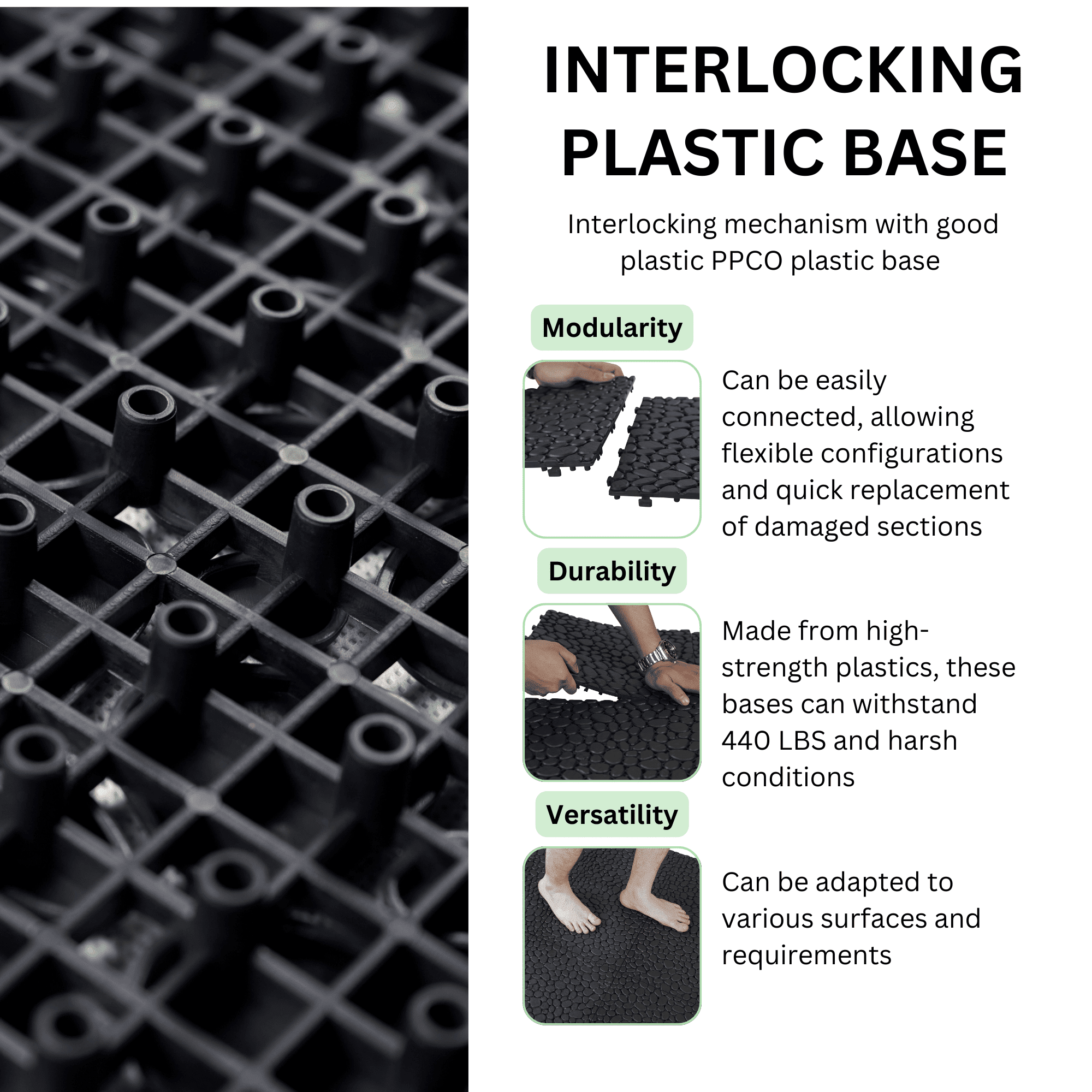 LIGHTWEIGHT BUT STURDY: our interlocking deck tiles, made from high-strength plastic. With superior stability, they're perfect for outdoor flooring, patio tiles, or even as pavers for an outside walkway. Resistant to expansion and capable of enduring various weather conditions, they're suitable for year-round usage in your backyard, balcony, or any outdoor space. More waterproof and durable than wood, these deck tiles provide a reliable solution for patio flooring outdoor waterproof needs.