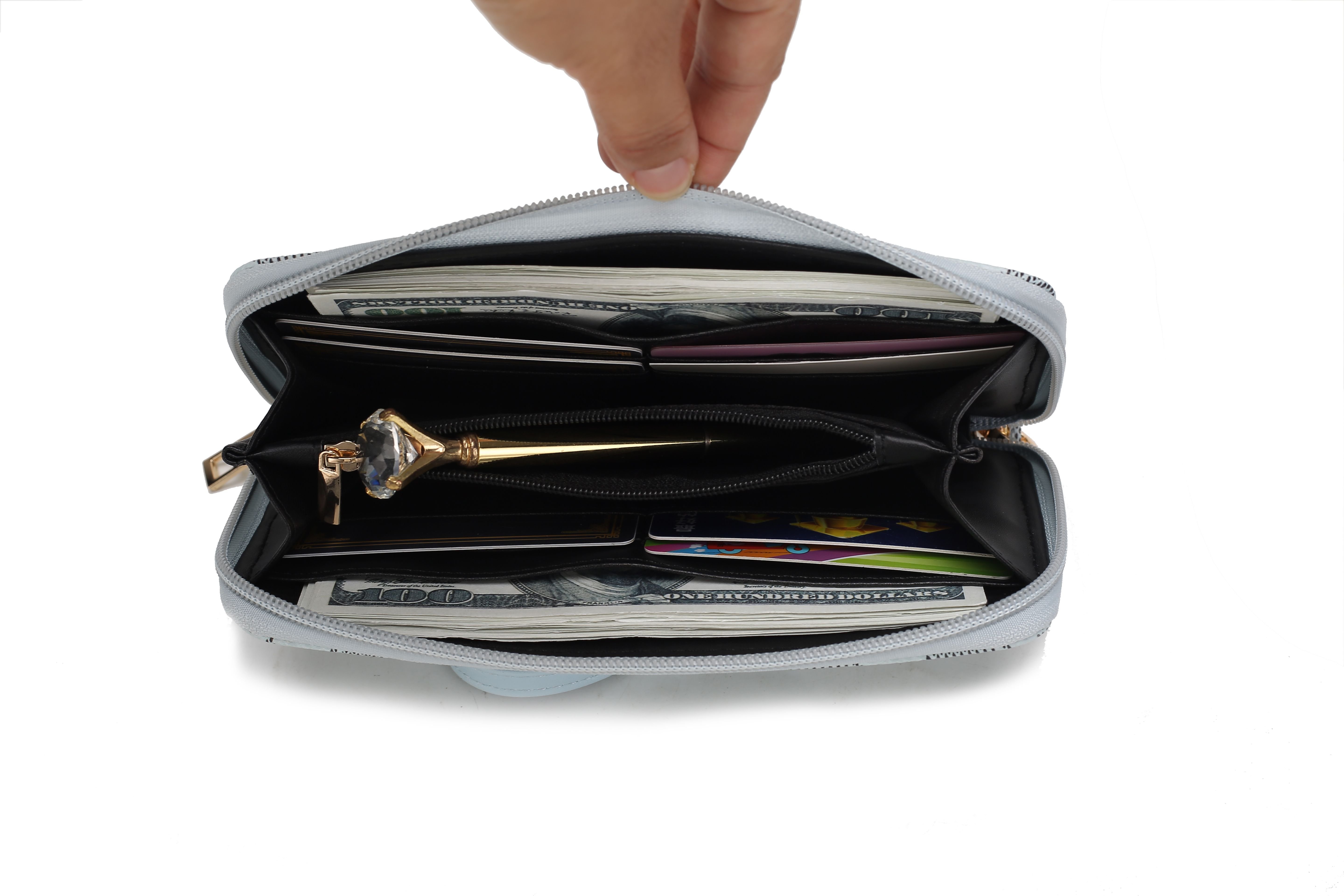 • 1 center zip pocket; 8 card slots; 2 slip pockets; zip fastening