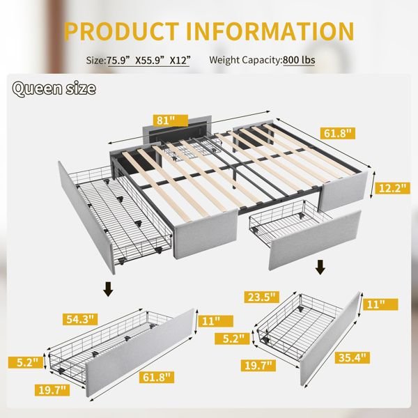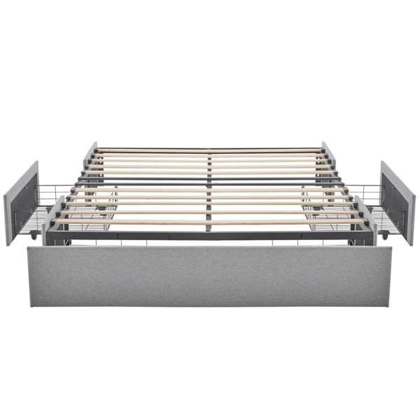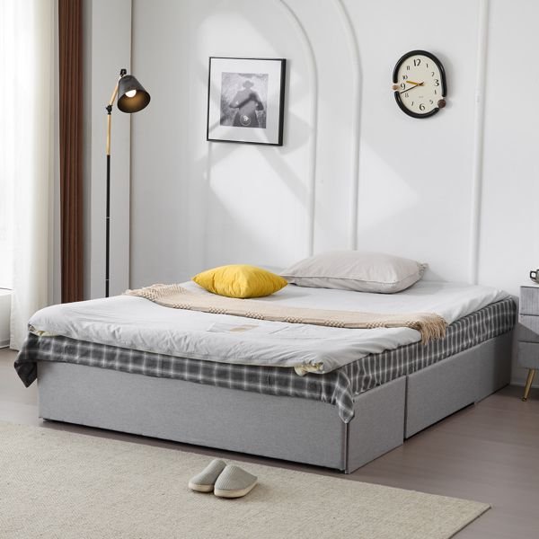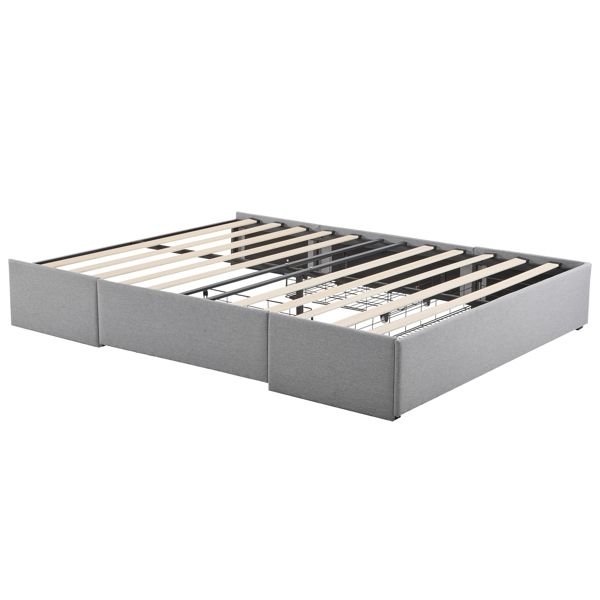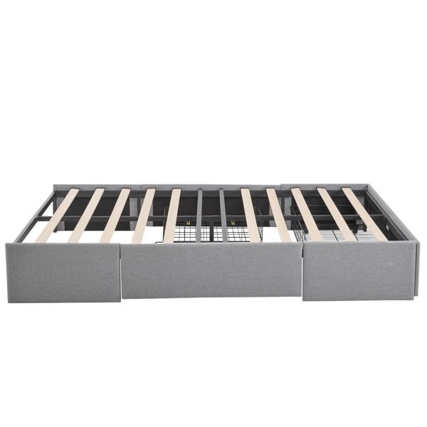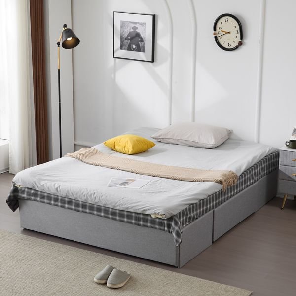 Maximize both comfort and storage with this stylish upholstered full bed frame. Featuring three spacious drawers—one large drawer at the foot and two side drawers—this platform bed provides an ideal solution for storing bedding, clothing, or accessories. The bed is upholstered in soft linen fabric, adding a touch of luxury to any bedroom, while the sturdy wooden slat system ensures reliable support without the need for a box spring. With easy assembly and a customizable headboard option, this bed frame offers both convenience and elegance for modern living spaces.Upholstered Platform Bed